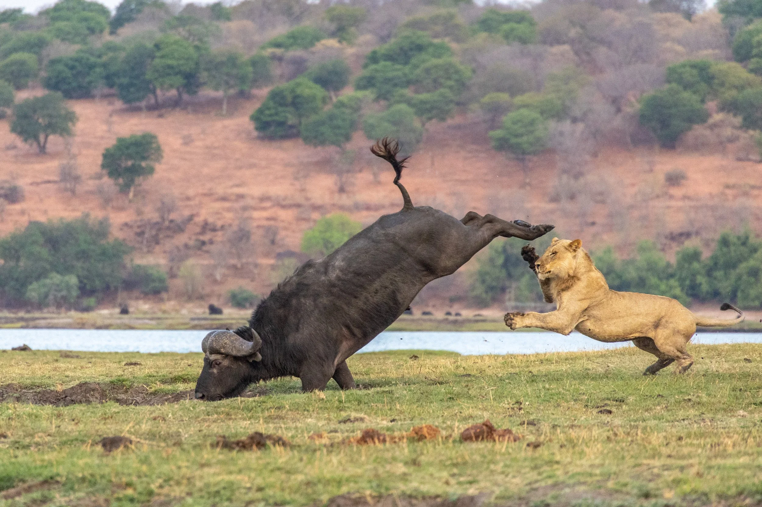 There was a great deal of skill shown by the tracker and guide in order to get this shot. The lioness was stalking in the undergrowth,, i was pitch black but the guide predicted where she would attack. We were only inches away when she took down this giant Kudu, single handedly and in the dark!